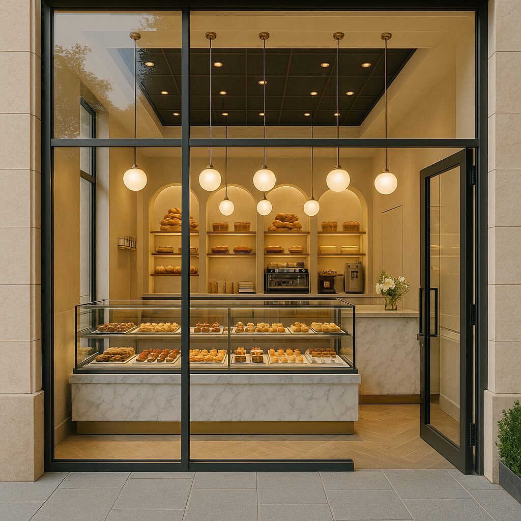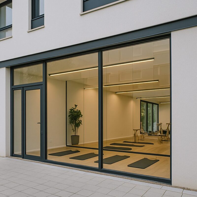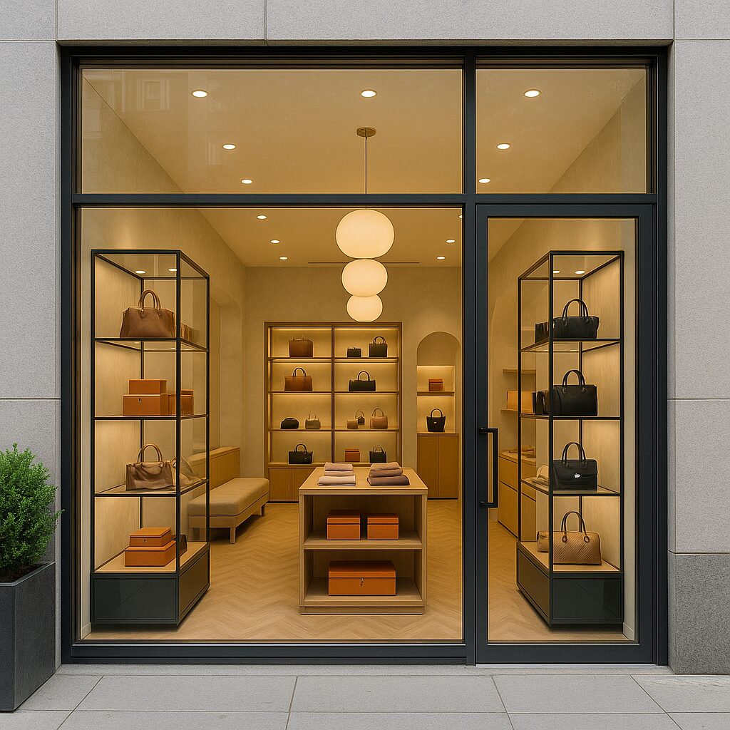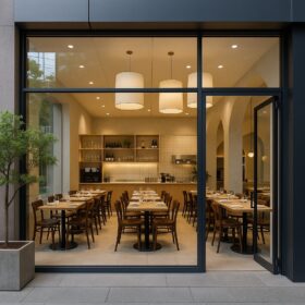 חנויות, מסעדות ובתי קפה – עם פרופילים מינימליים, זכוכית מחוסמת חזקה במיוחד, ודלתות פתיחה או הזזה.