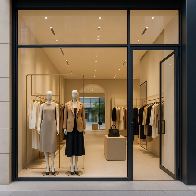 חנויות, מסעדות ובתי קפה – עם פרופילים מינימליים, זכוכית מחוסמת חזקה במיוחד, ודלתות פתיחה או הזזה.